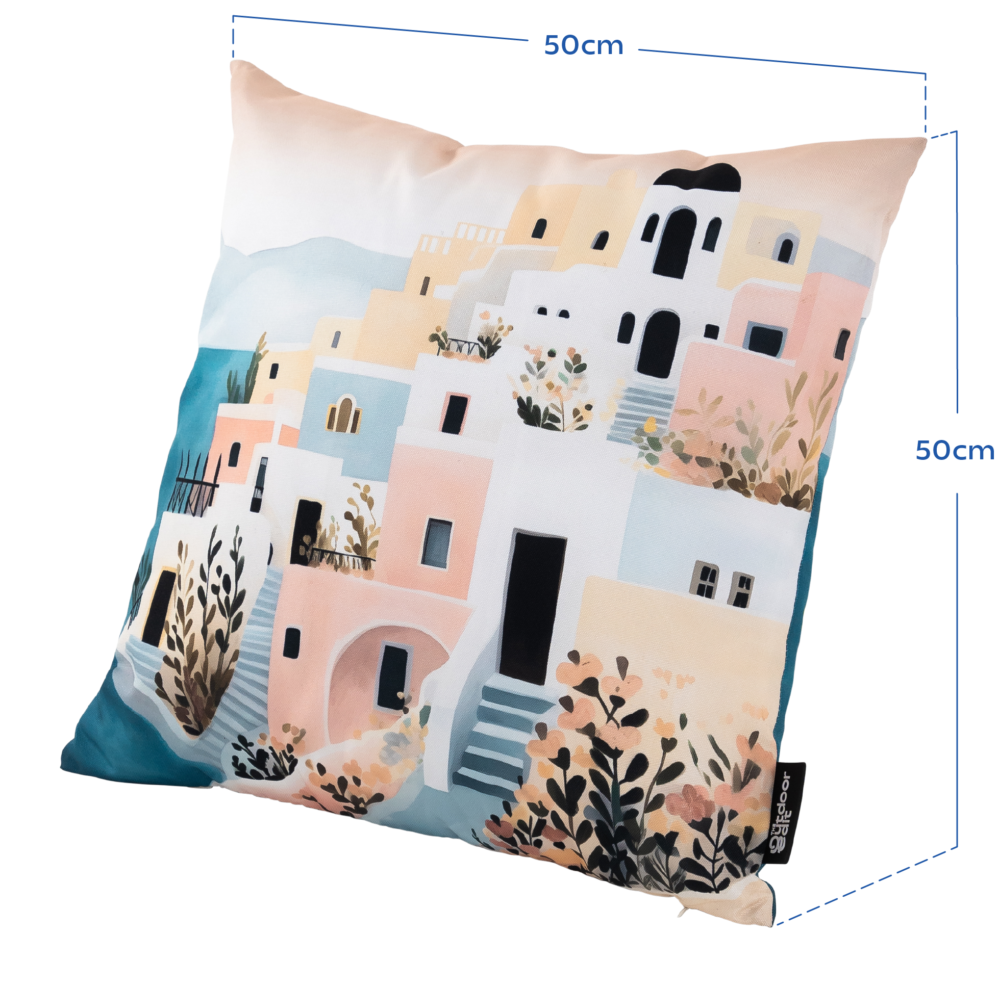 Transport yourself to a sun-soaked waterfront vista with this 50cm x 50cm square cushion featuring an Italian coastal scene, inspired by warm European summers.