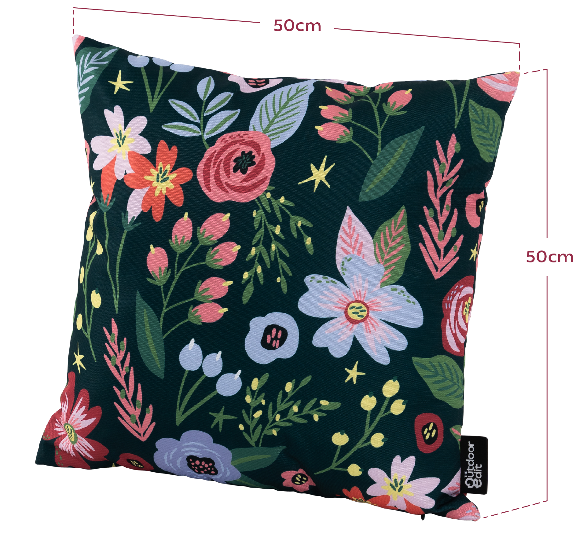 A classic 50cm x 50cm square cushion with a maximalist dark floral pattern, inspired by deep forest meadows.