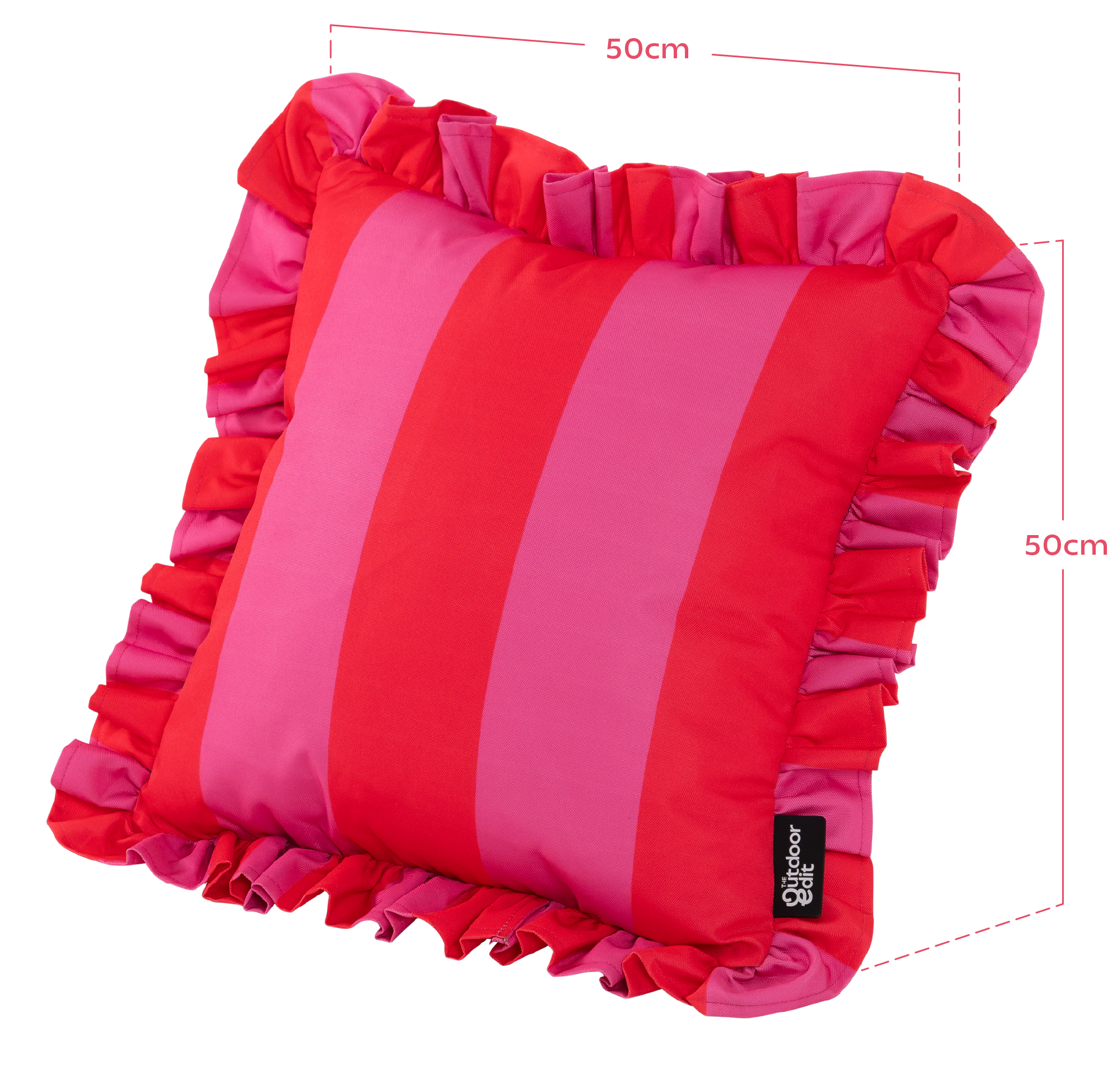 A classic 50cm x 50cm square cushion with bold red and pink stripes and on-trend frills, mixing classical styling with playful elegance.