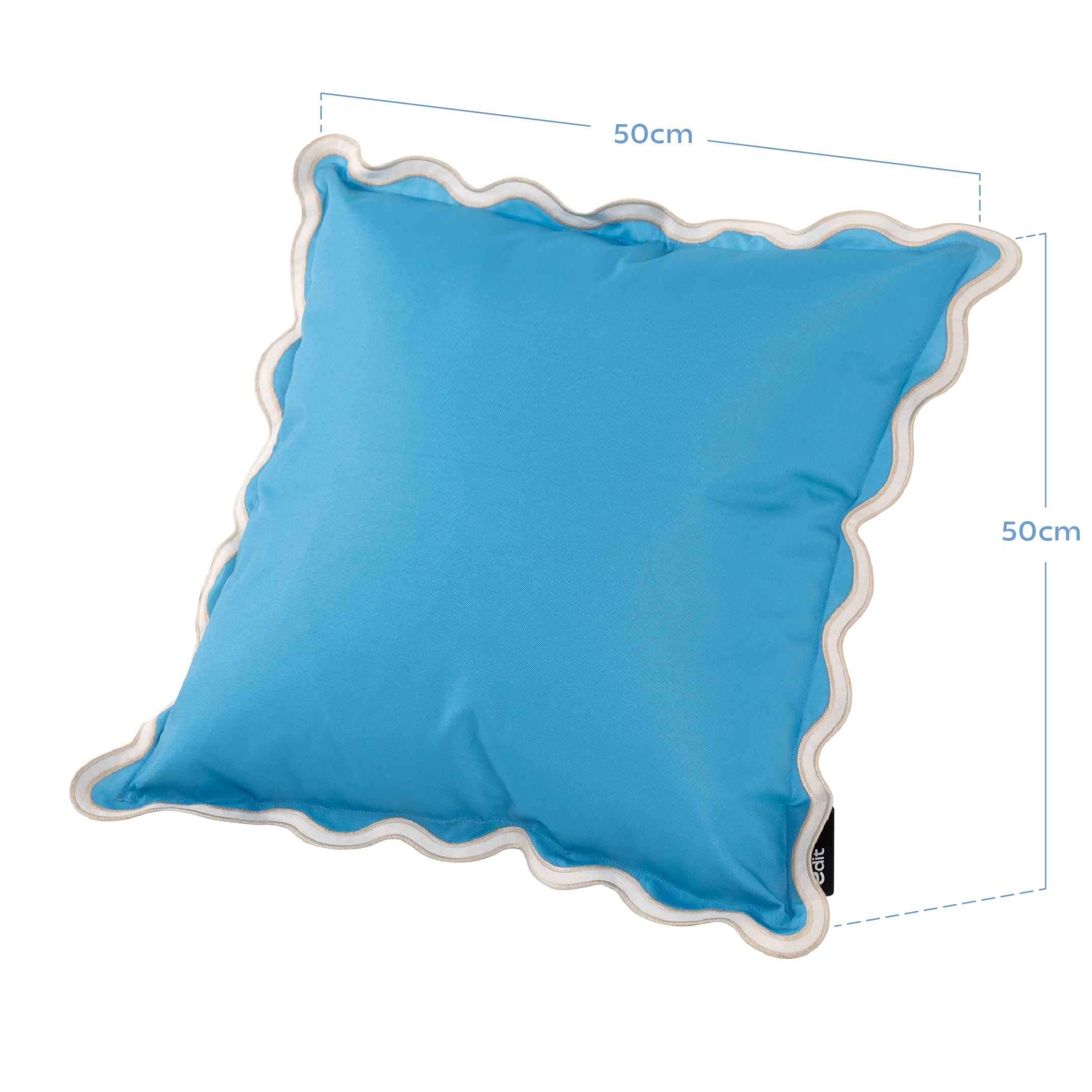 A classic 50cm x 50cm square cushion in light blue with a playful cream scalloped edge, reminiscent of white sandy beaches and blue skies.