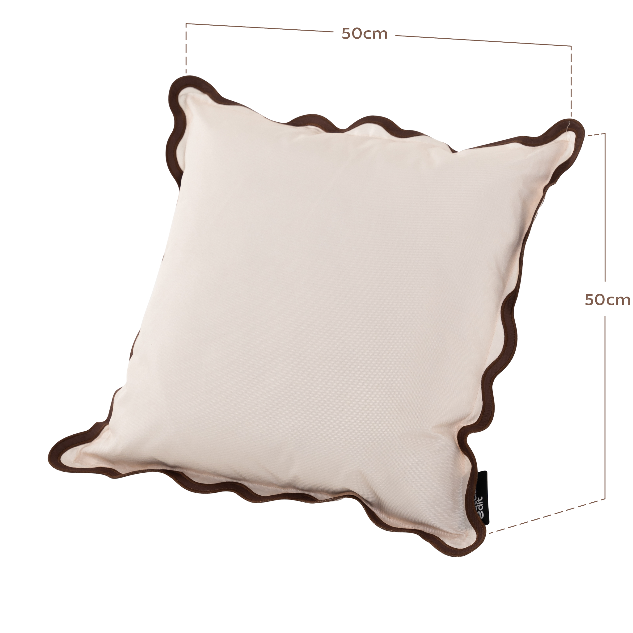 A classic 50cm x 50cm square cushion in light cream with a deep brown scalloped edge, inspired by the understated and sophisticated charm of Mediterranean cafés.