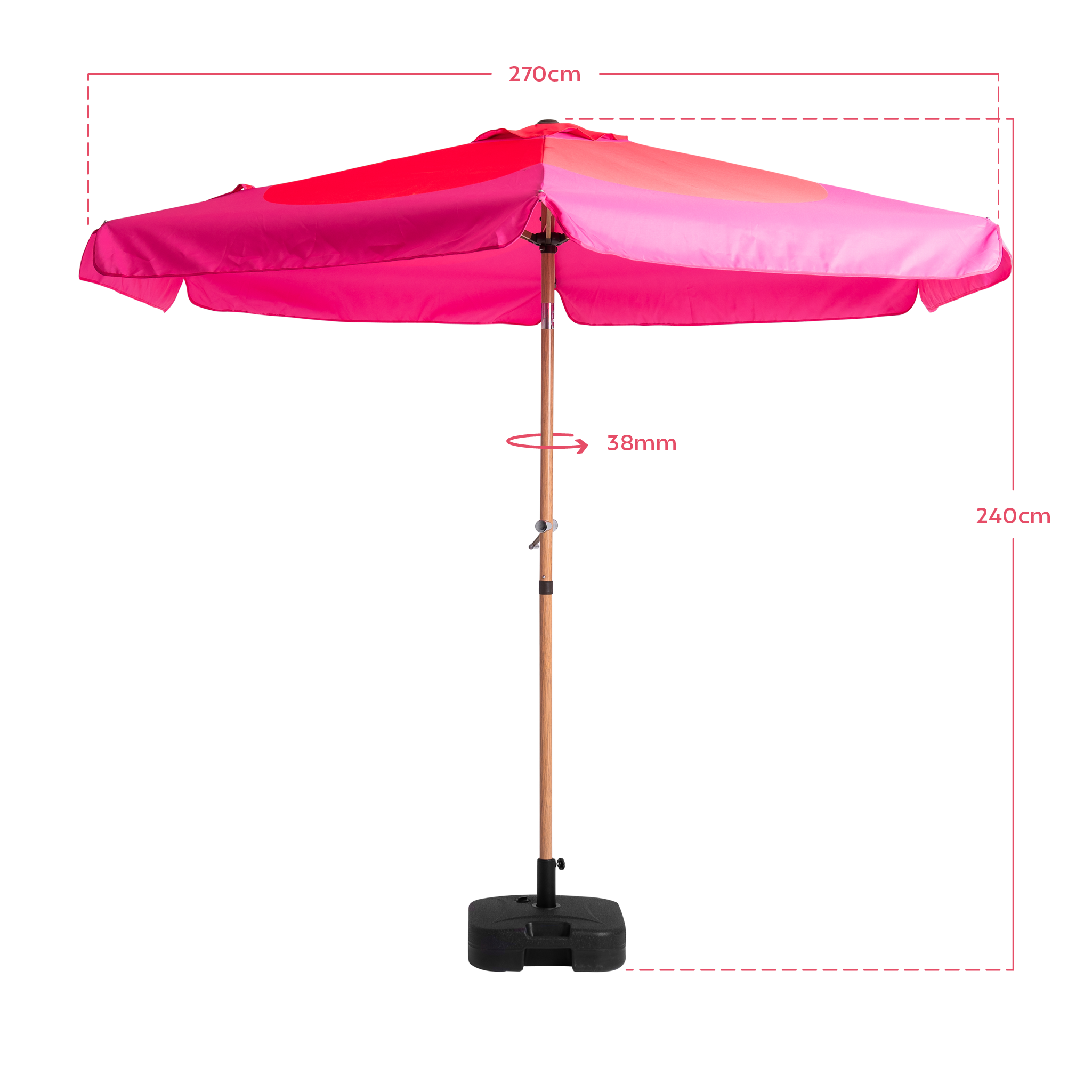 Part of the Moments of Joy edit, The Blossom is designed to brighten your garden with its bold crimson centre. Boasting a generous 2.7m diameter and tilt function, it provides all day shade to allow you to indulge in life’s joyful moments without interruption. Its bold pink floral geometric print canopy paired with our wood effect aluminium pole creates a look of playful elegance, inspired by hot summer days and bright colourful sorbets.