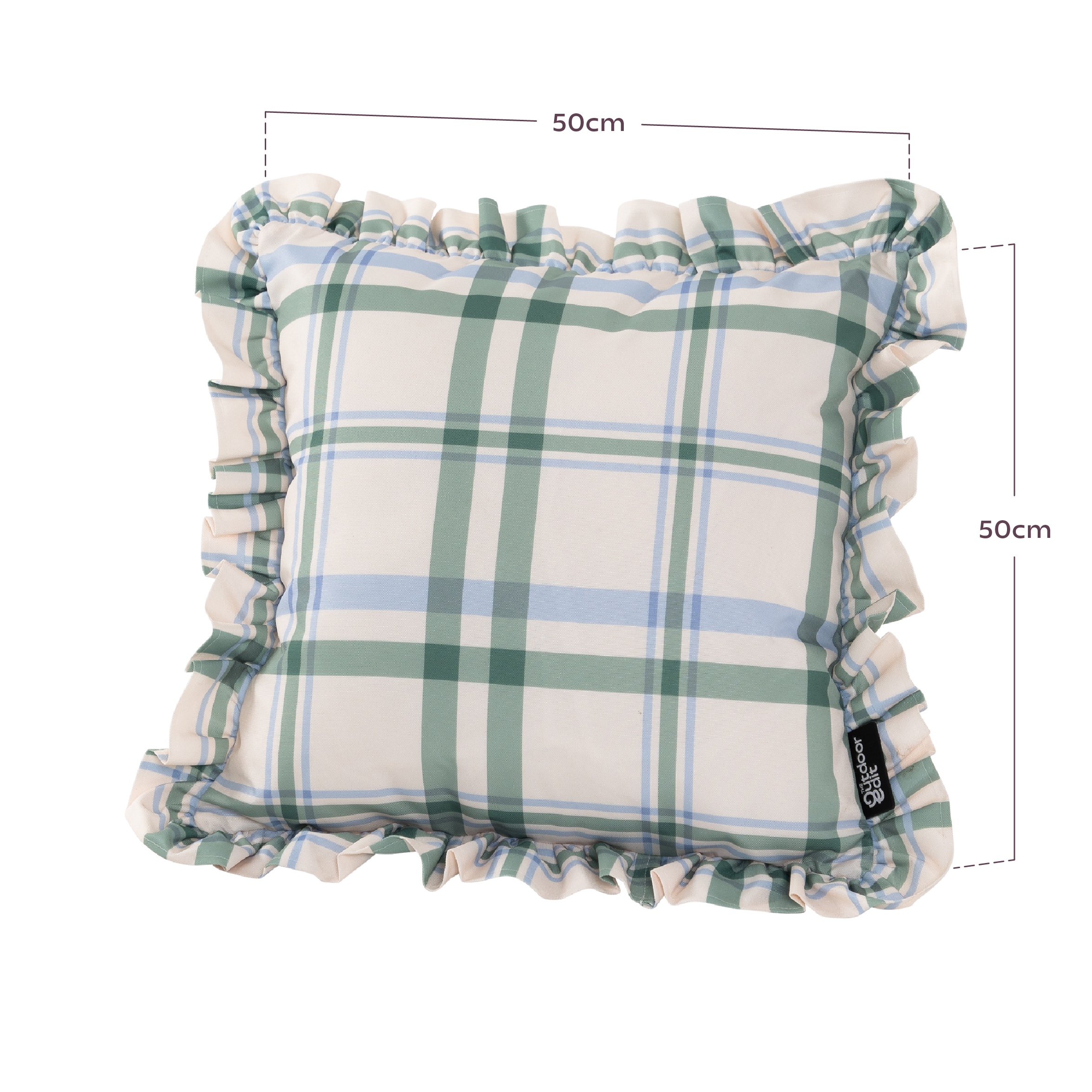 The Farmhouse Tartan Frilled Outdoor Cushion - a classic square cushion with a country-core inspired tartan pattern and on-trend frills, bringing vintage charm and cosy textures.