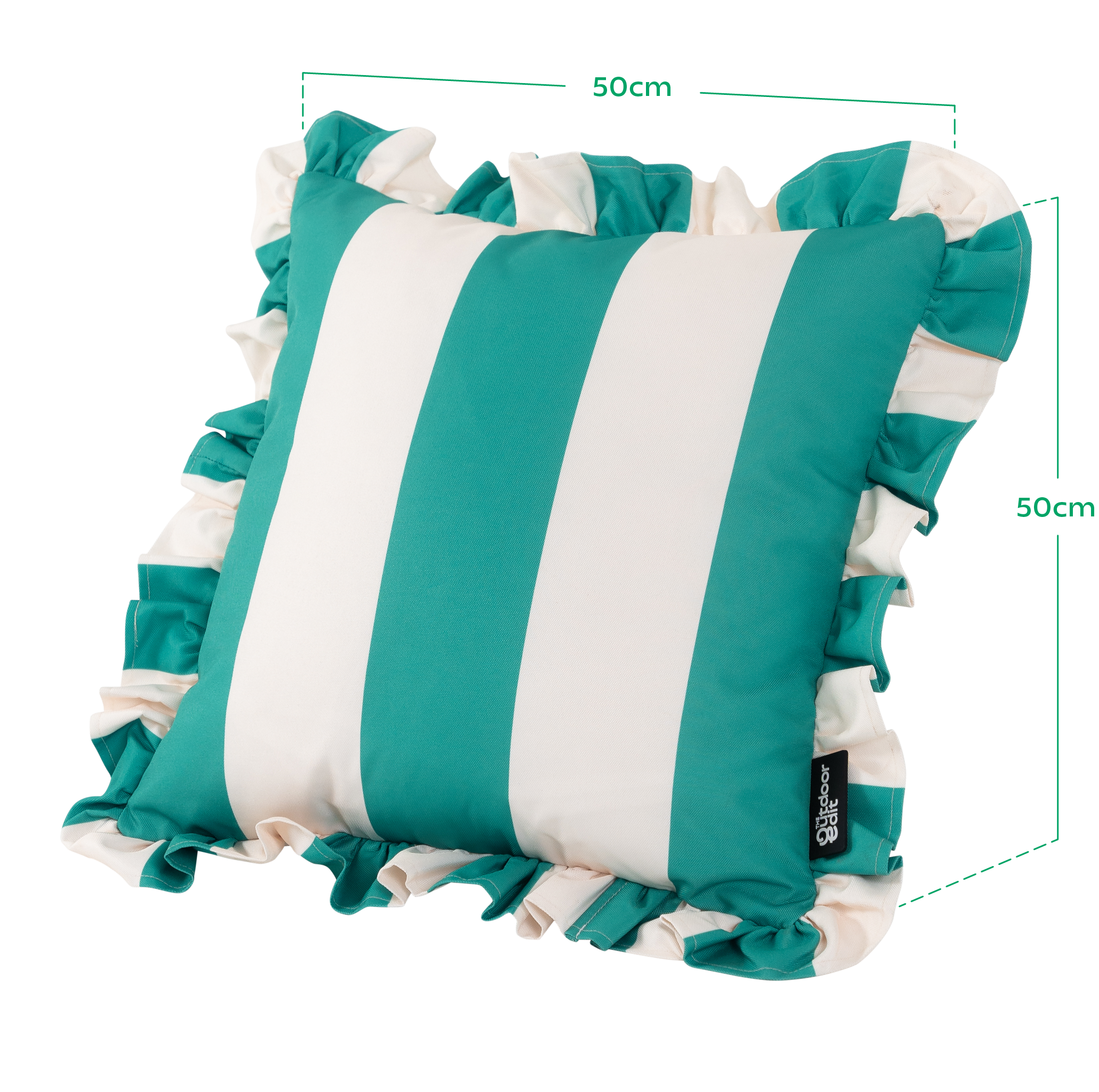 The Green Block Stripe Frilled Outdoor Cushion - a classic square cushion shape with a bold, thick modern stripe and on-trend frills.