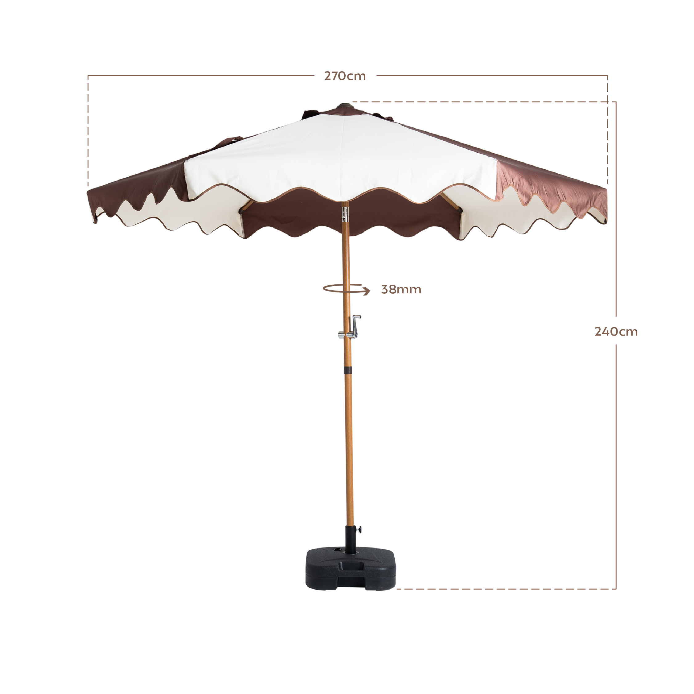 Part of the Coffee Naturals edit, The Scallop is designed to turn your garden into a beautiful Mediterranean bistro with its trending espresso brown colour block and scalloped edge. Boasting a generous 2.7m diameter and tilt function, it provides all day shade to allow you to drink in the soothing summer vibes. Its natural brown and cream printed canopy paired with our wood effect aluminium pole creates a calming minimalist look, inspired by relaxing summer days sipping espressos in the sun.