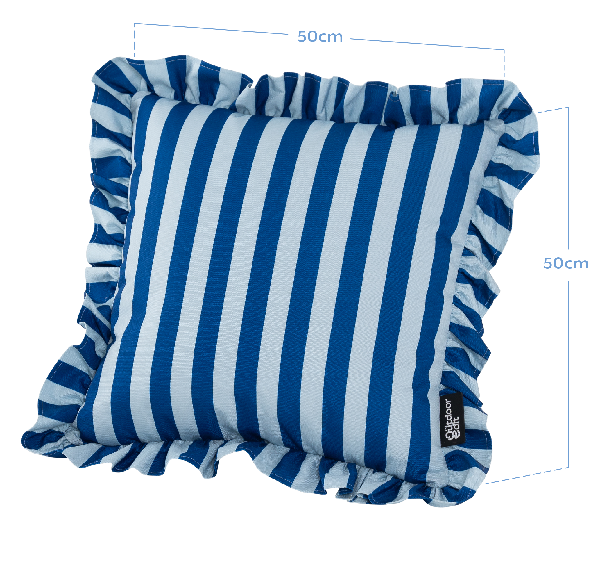 The Ocean Blue Stripe Frilled Outdoor Cushion - a classic square cushion shape with rich blue nautical-inspired stripes and on-trend frills, inspired by coastal tranquillity and modern finesse.